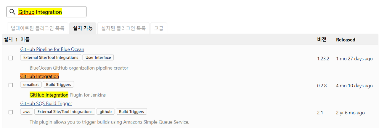 Github와 Jenkins를 연결하려면 Github Integeration Plugin이 필요하다.