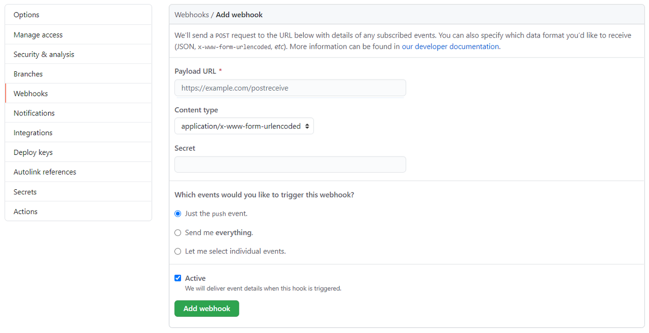 나머지 항목은 기본으로 설정하고 "Add webhook" 클릭