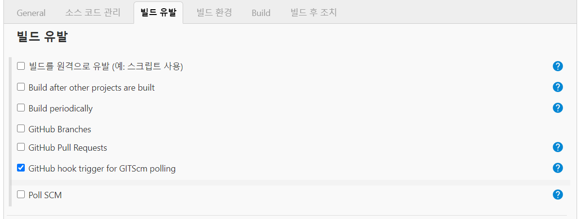 빌드 유발 탭 이동 >> GitHub hook trigger for GITScm polling 체크